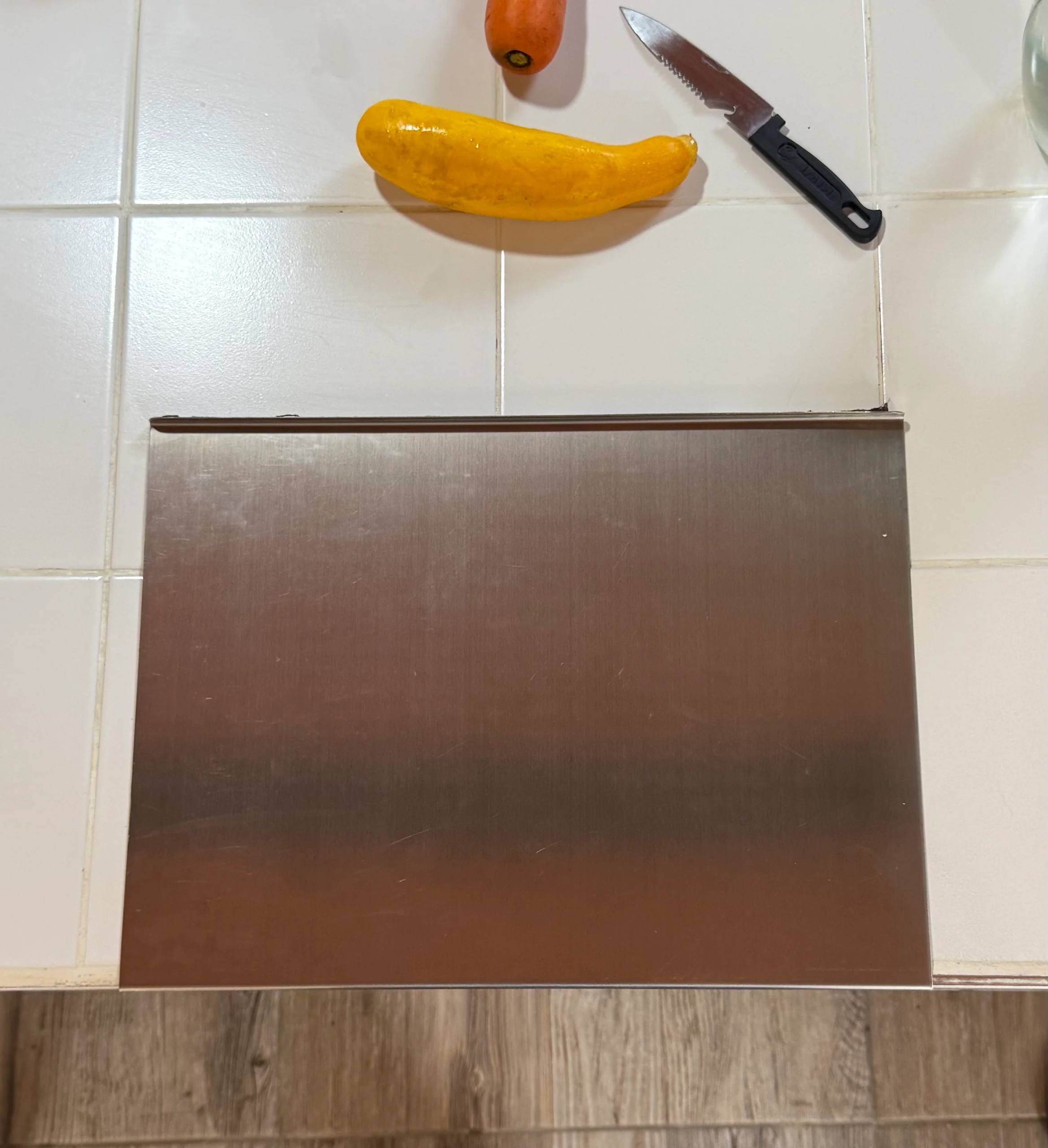 • Con ceja para embonar en mesón de cocina, y tope para los alimentos cortados